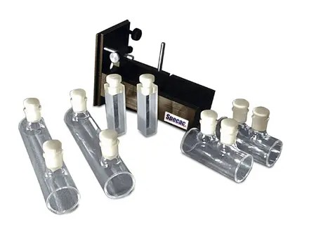 The Oil-in-Water Analysis kit consists of matched quartz cells and a slide-mount holder chosen to match the requirements of the ASTM D7066 method for measurement of extracted hydrocarbon contaminants in water.